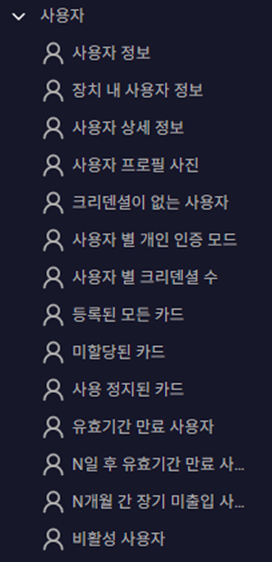 장치 내 사용자 정보: 장치에 등록된 사용자의 정보를 조회할 수 있습니다.