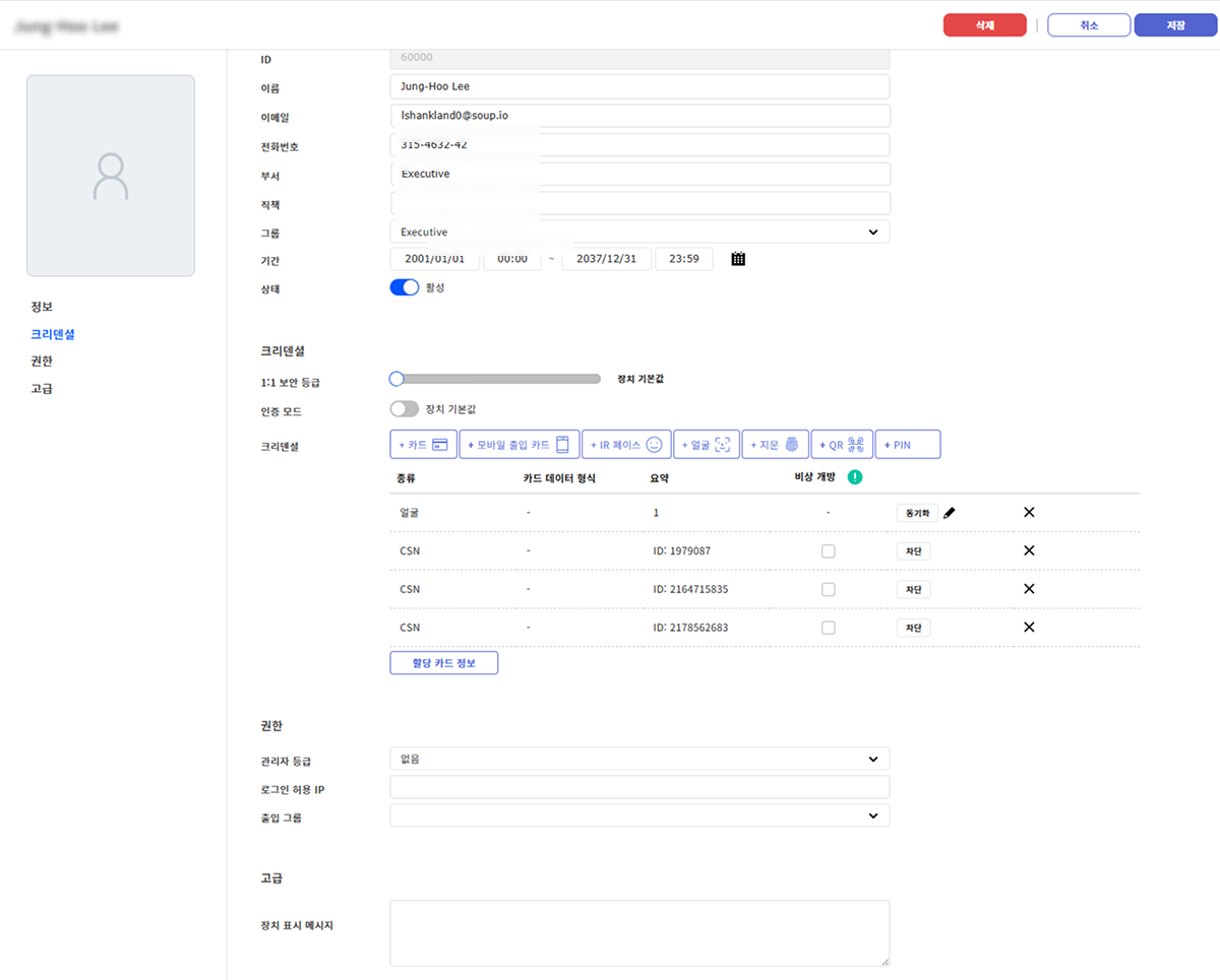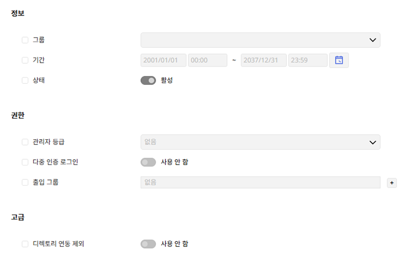 한 번에 여러 사용자의 정보나 출입 권한을 수정할 수 있습니다. 이 기능은 다수의 사용자에게 동일한 출입 권한이나 그룹을 설정할 때 유용합니다.