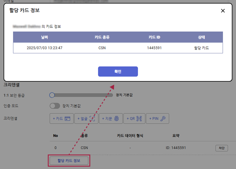 사용자에게 할당된 카드 정보를 확인하려면 크리덴셜 섹션의 할당 카드 정보 버튼을 클릭하세요. 카드를 할당한 날짜 및 카드 종류, 카드 아이디, 상태를 확인할 수 있습니다.