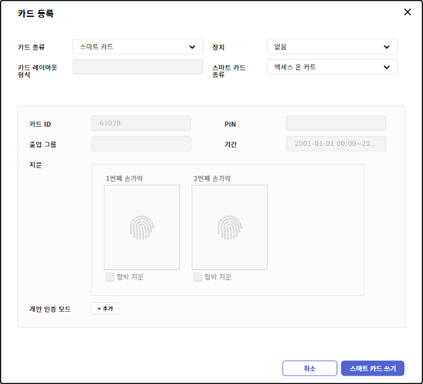 커스텀 스마트 카드: 타사에서 발급한 스마트 카드를 등록할 수 있습니다. 카드 읽기 버튼을 클릭해 카드 ID를 등록하세요.