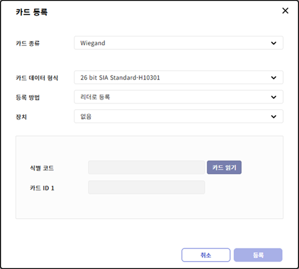 카드 등록 창이 나타나면 카드 종류 옵션에서 Wiegand을 선택하세요.