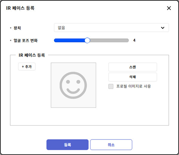프로필 이미지로 사용: 등록한 IR 페이스 이미지를 프로필 이미지로 사용하려면 해당 옵션의 체크박스를 클릭하세요.