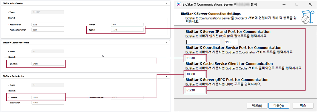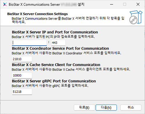 | BioStar X Service Manager | 커뮤니케이션 서버 설치 시 입력 정보 |