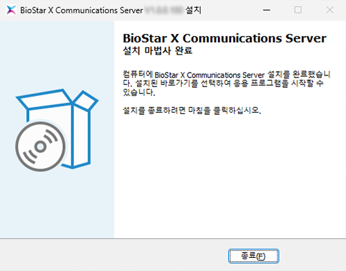 커뮤니케이션 서버 설치를 완료합니다. 설치를 완료하면 BioStar X 메인 서버에서 커뮤니케이션 서버와 연결되었는지 확인하세요.