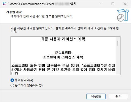 슈프리마 다운로드 센터로 접속해 로그인한 후 설치 패키지(BioStar X Communications Server.X.Y.X.BB.exe)를 다운로드하세요.