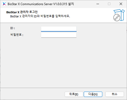 BioStar X의 관리자 아이디와 비밀번호를 입력하고 다음 버튼을 클릭하세요.