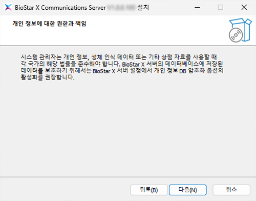 개인 정보에 대한 권한과 책임 내용을 확인하고 설치를 계속하려면 다음 버튼을 클릭하세요.