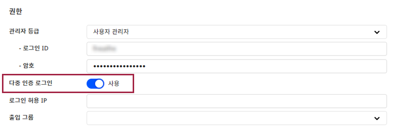 사용자 프리뷰 화면이 나타나면 권한 섹션에서 다중 인증 로그인 항목을 사용으로 설정하세요.