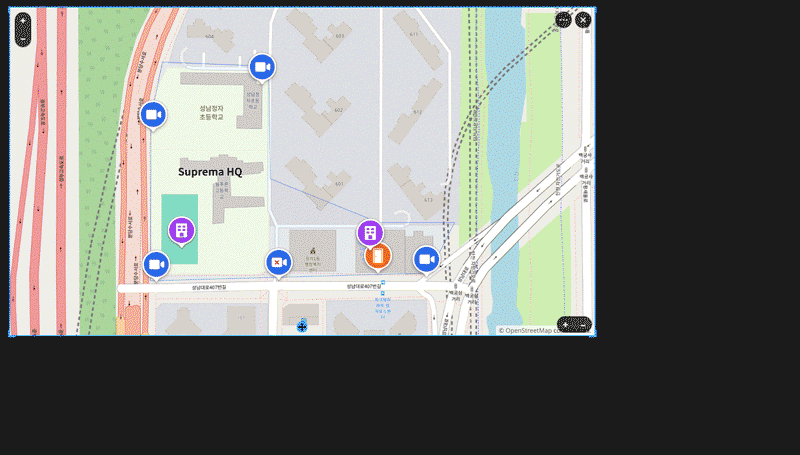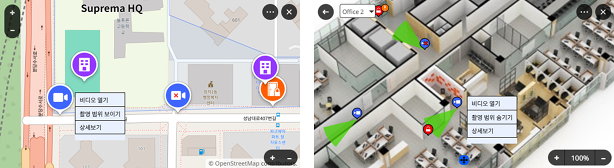맵에서 층으로 진입하려면 시설(Facility)을 클릭하세요. 팝업 메뉴에 진입할 수 있는 층 목록이 표시되면 원하는 층을 선택하세요. 선택한 층의 도면과 출입문, 카메라를 확인할 수 있습니다.