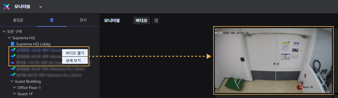비디오 타일에 카메라 영상을 배치하고 재생하려면, 화면 왼쪽 사이드바의 맵 목록에서 카메라를 더블 클릭하세요. 또는 마우스 오른쪽 버튼을 클릭하고 팝업 메뉴에서 비디오 열기를 클릭하세요.