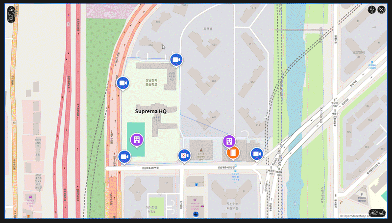 맵에 표시되는 구성 요소는 구역(Area)과 시설(Facility), 시설에 연결된 카메라를 확인할 수 있습니다. 시설을 통해서 층(Floor)으로 접근할 수 있습니다. 층에는 출입문과 카메라를 확인할 수 있습니다.
