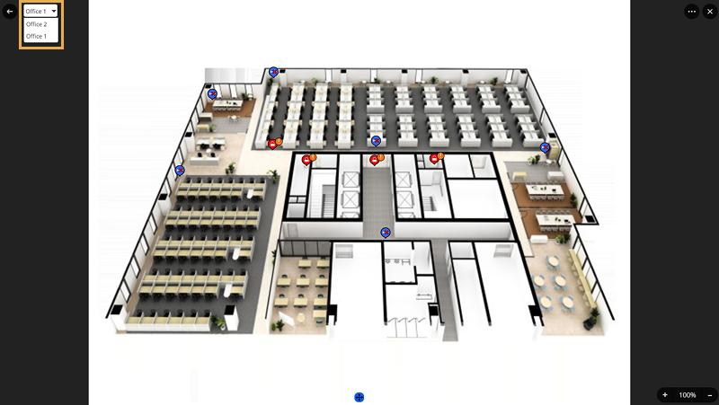 맵 왼쪽 상단의 층 선택 옵션은 시설(Facility)에 설정되어 있는 층(Floor)만 표시합니다. 해당 층이 시설에 설정되어 있지 않으면 목록에 표시되지 않습니다. 시설에 층을 설정하는 방법에 대한 자세한 내용은 다음 문서를 참고하세요.