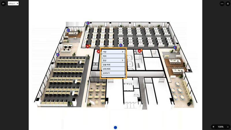 | 출입문: 맵에 배치된 출입문을 클릭하면 해당 출입문을 제어할 수 있는 팝업 메뉴가 표시됩니다. 제공하는 기능에 대한 자세한 내용은 다음 문서를 참고하세요. | |