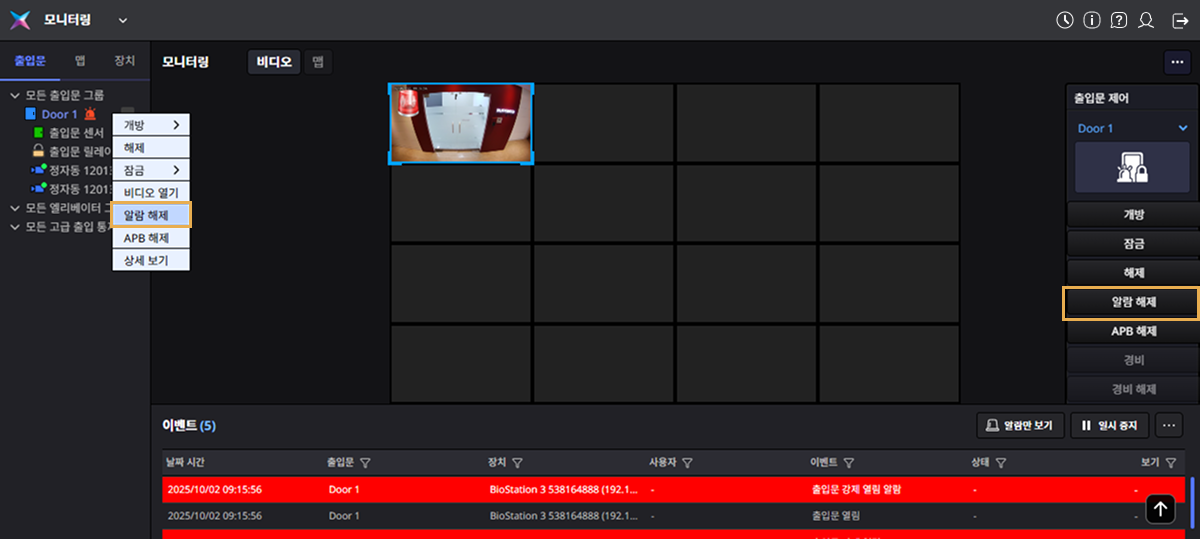 출입문의 알람을 해제하려면 출입문 목록에서 오른쪽 마우스 버튼을 클릭하고, 팝업 메뉴에서 알람 해제를 클릭하세요. 또는 출입문 제어 도구에서 알람 해제를 클릭하세요.