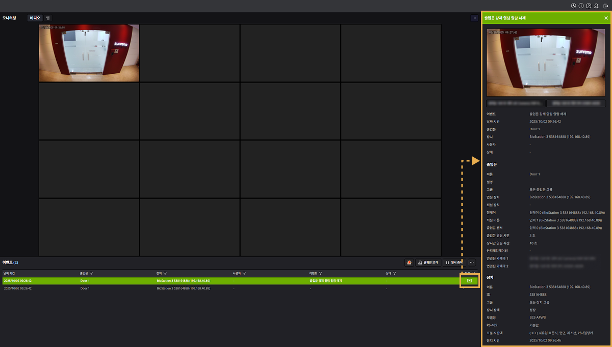 규칙으로 설정된 출입문에 특정 이벤트가 발생하면 이벤트 섹션 목록의 해당 이벤트 항목에는 비디오 로그() 아이콘이 표시됩니다. 비디오 로그 아이콘이 표시된 이벤트 항목을 클릭하면 화면 오른쪽에 상세 정보가 나타납니다. 특정 이벤트가 발생한 시간의 영상을 확인할 수 있습니다.