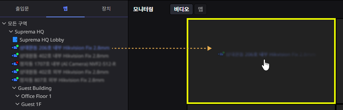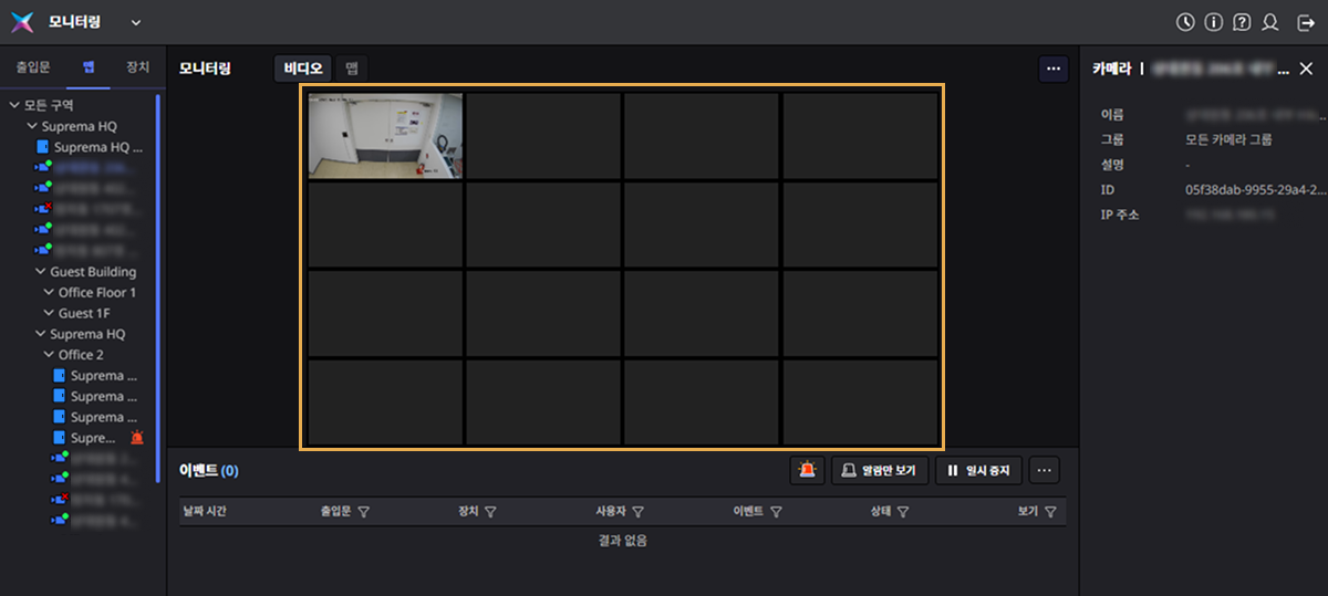 화면 왼쪽 사이드바에서 출입문 또는 맵, 장치 탭에서 영상을 확인할 카메라 장치를 선택하세요.