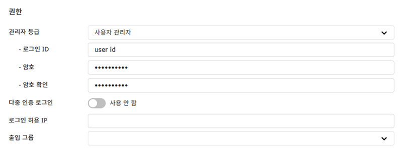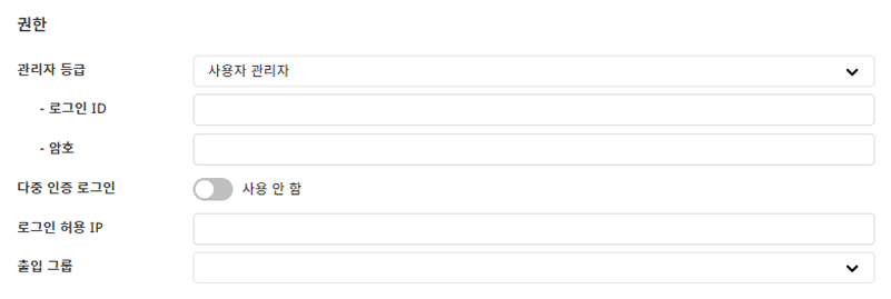 사용자 IP 주소를 등록하면, 계정에 등록한 IP 정보와 일치할 경우에만 PC에 로그인할 수 있습니다. 이를 통해 보안을 강화할 수 있습니다. 권한 섹션의 로그인 허용 IP 항목에 사용자의 IP 주소를 입력하세요.