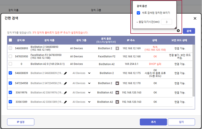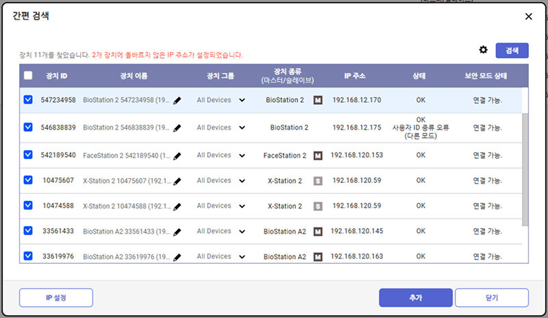 IP 주소를 사용할 수 없거나 변경이 필요한 장치는 IP 설정 버튼을 클릭해 변경할 수 있습니다. 자세한 내용은 다음 문서를 참고하세요.