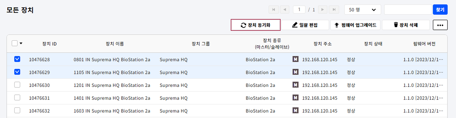 장치 목록에 추가한 장치가 나타납니다. 추가한 장치를 선택하고 장치 동기화 버튼을 클릭하세요.