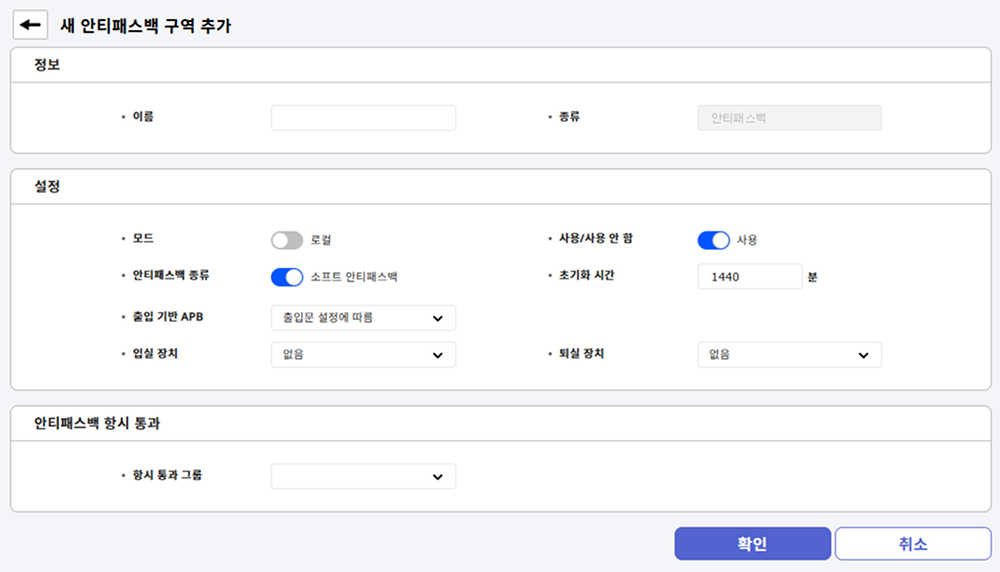 초기화 시간: 안티패스백 규칙을 위반한 사용자에게 출입을 다시 허용할 때까지의 대기 시간을 설정하세요. 알람 발생 후 설정된 시간이 지나면 해당 사용자의 출입을 자동으로 허용합니다.