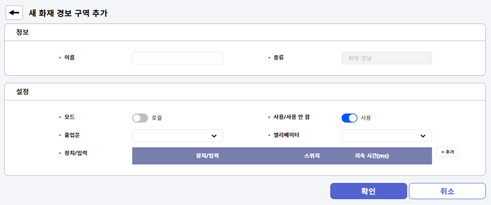 화재 경보 설정을 위한 세부 항목은 아래와 같습니다.