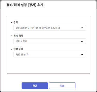 경비/해제의 개시 (장치) 옵션에서 + 추가 버튼을 클릭하세요. 경비 기능을 제어할 장치를 선택하고 경비 종류를 선택하세요.