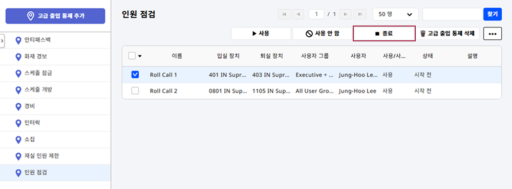 인원 점검 설정 목록 중 활성 또는 비활성화할 항목의 체크박스를 클릭하세요.