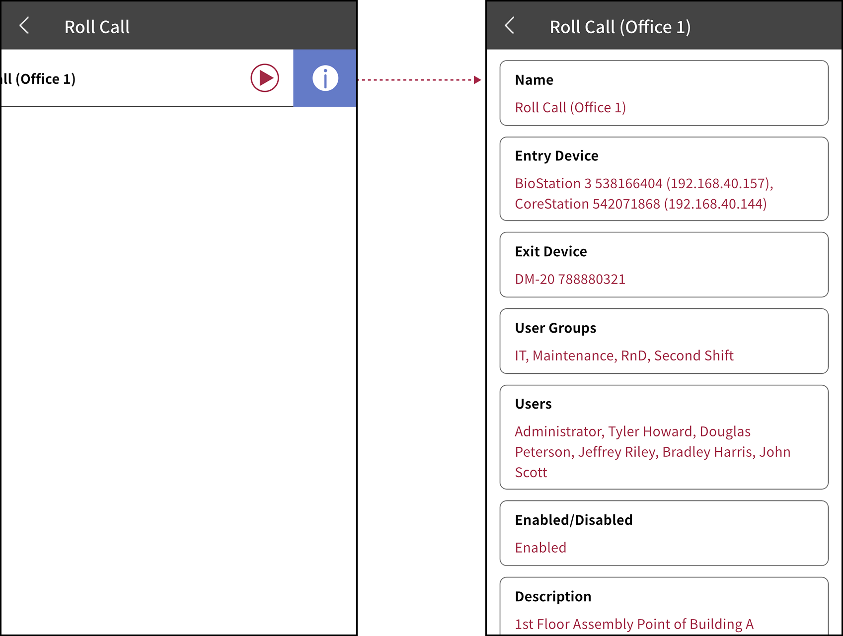 Roll Call 목록에서 인원 점검을 실행할 항목의 버튼을 탭하세요.