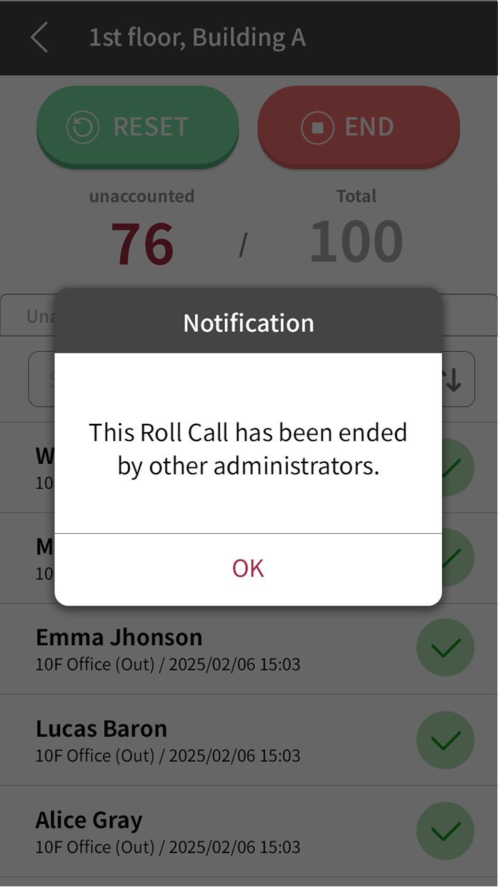 다른 관리자에 의해 인원 점검이 종료되면 알림 메시지가 나타납니다.