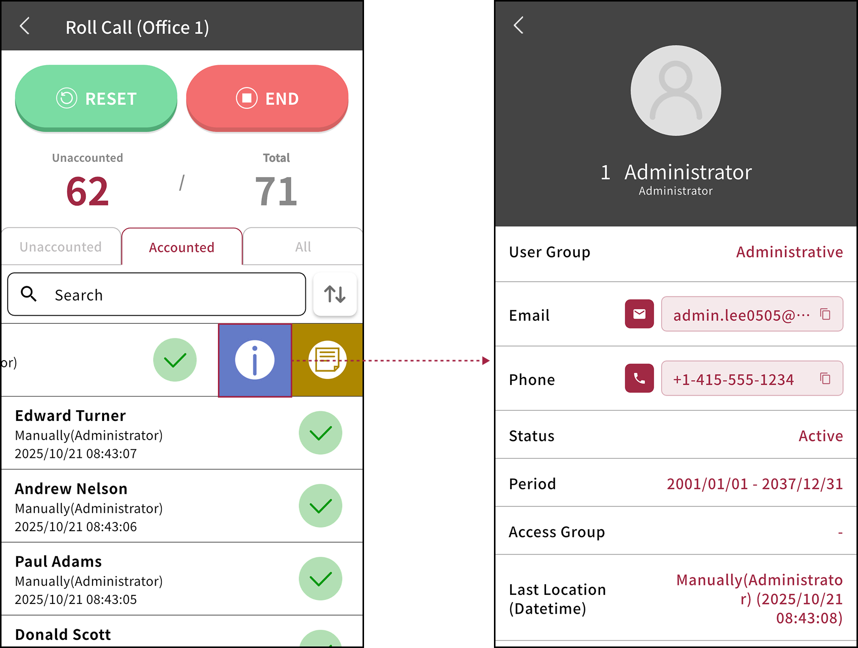 모바일 앱에서 인원 점검 진행 중 각 사용자의 정보를 확인할 수 있습니다. 사용자에게 긴급 연락이 필요하거나 현재 사용자의 위치를 파악할 때 유용하게 사용할 수 있습니다.