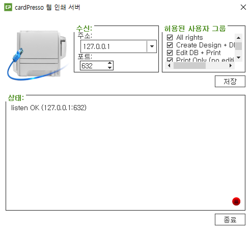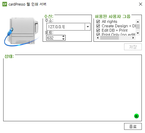 포트: cardPresso에서 인쇄 동작을 수신하는데 사용하는 포트 번호입니다.