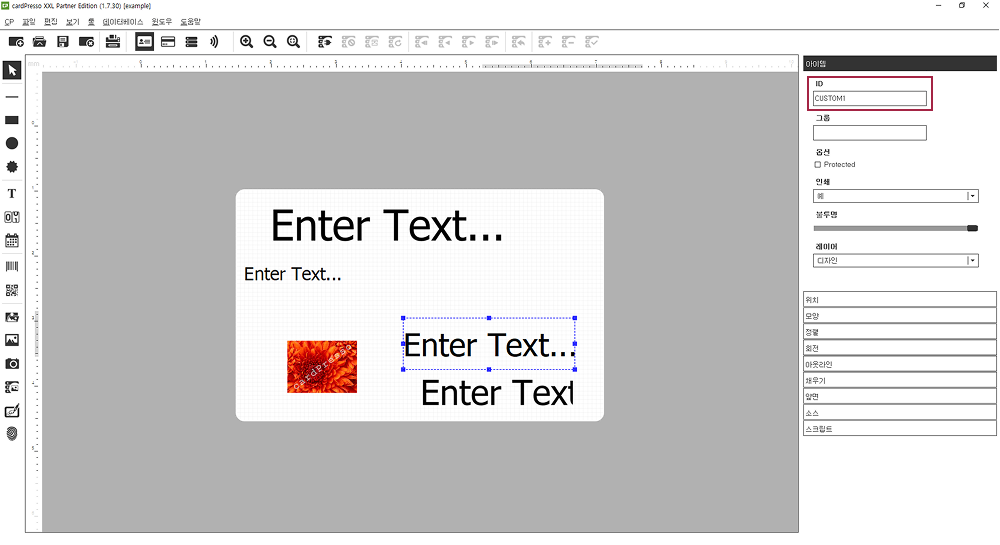 cardPresso 프로그램에서 파일 → 템플릿 열기를 클릭해 카드 템플릿 파일을 여세요. 새로운 속성을 추가하고 BioStar X 속성 ID 순서에 알맞은 XML 항목 ID 이름으로 ID를 입력하세요.