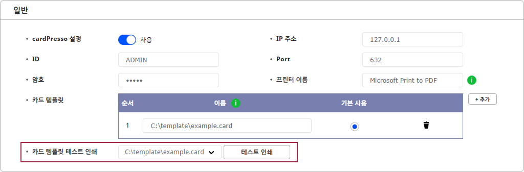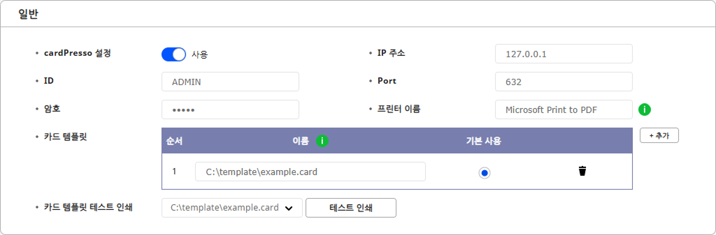Port: cardPresso에서 인쇄 동작을 수신하는데 사용하는 포트 번호입니다.