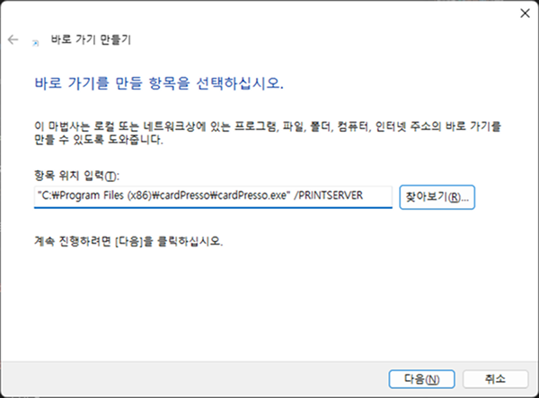 설치 환경에 따라 cardPresso가 설치된 경로가 다를 수 있습니다. cardPresso가 설치된 경로를 확인한 후, 위 경로를 알맞게 수정하세요.