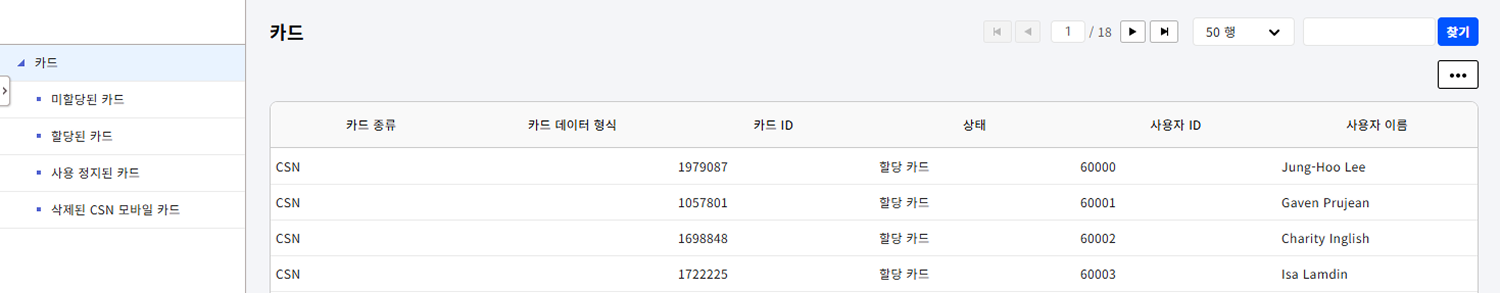 할당된 카드: 특정 사용자에게 할당한 카드입니다. 카드 목록에서 할당된 사용자의 아이디와 이름을 확인할 수 있습니다.