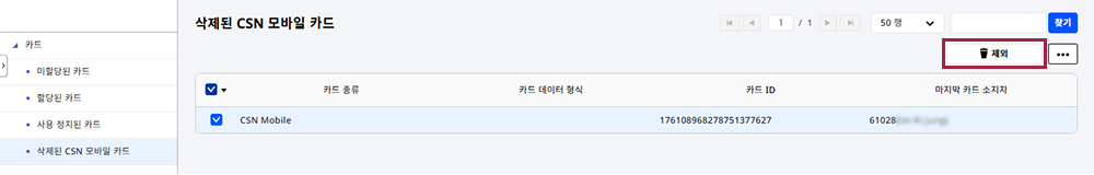삭제된 CSN 모바일 카드 목록에 포함되어 있는 CSN 모바일 카드는 미할당된 카드 목록에서 삭제할 수 없습니다.