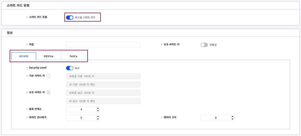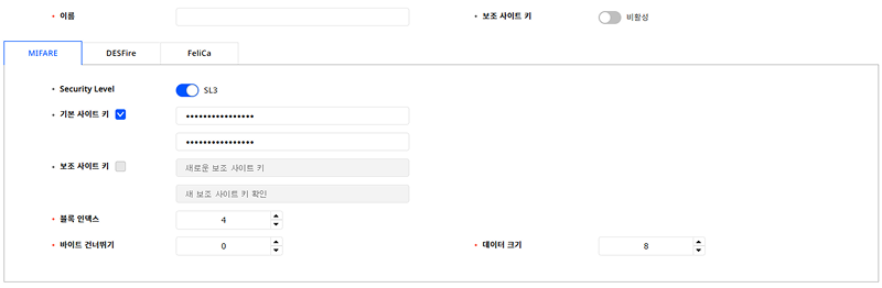 데이터 크기: (설정한 기본 사이트 키와 보조 사이트 키가 카드의 설정값과 동일한 경우) 읽어들일 카드의 데이터 크기를 설정할 수 있습니다.