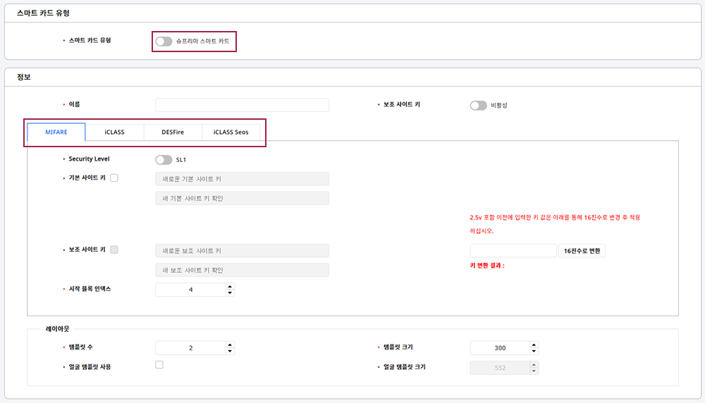 MIFARE, iCLASS, DESFire, iCLASS Seos와 같은 스마트 카드의 레이아웃을 설정할 수 있습니다.