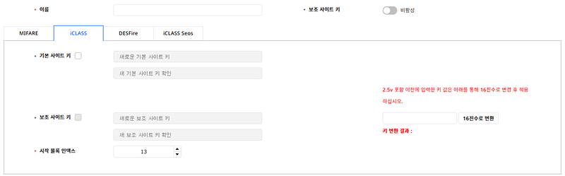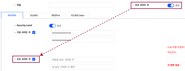 보조 사이트 키: 보조 사이트 키 사용 여부를 설정할 수 있습니다. 활성으로 설정하면 보조 사이트 키를 설정할 수 있습니다. 보조 사이트 키를 설정하면 카드의 기본 사이트 키가 일치하지 않을 때 보조 사이트 키를 사용하여 인증을 수행합니다.