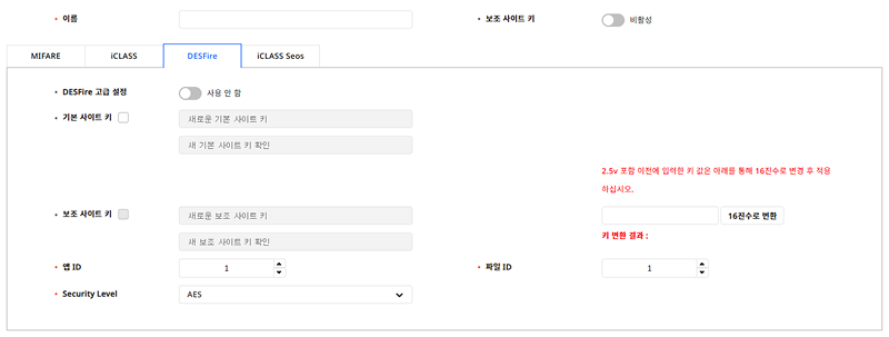 - DESFire 고급 설정: 타사에서 발급한 DESFire 카드를 사용할 수 있습니다. DESFire만 설정할 수 있습니다.