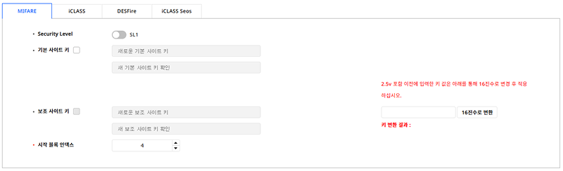 16진수로 변환 버튼은 스마트 카드 유형 옵션이 슈프리마 스마트 카드일때만 사용할 수 있습니다.