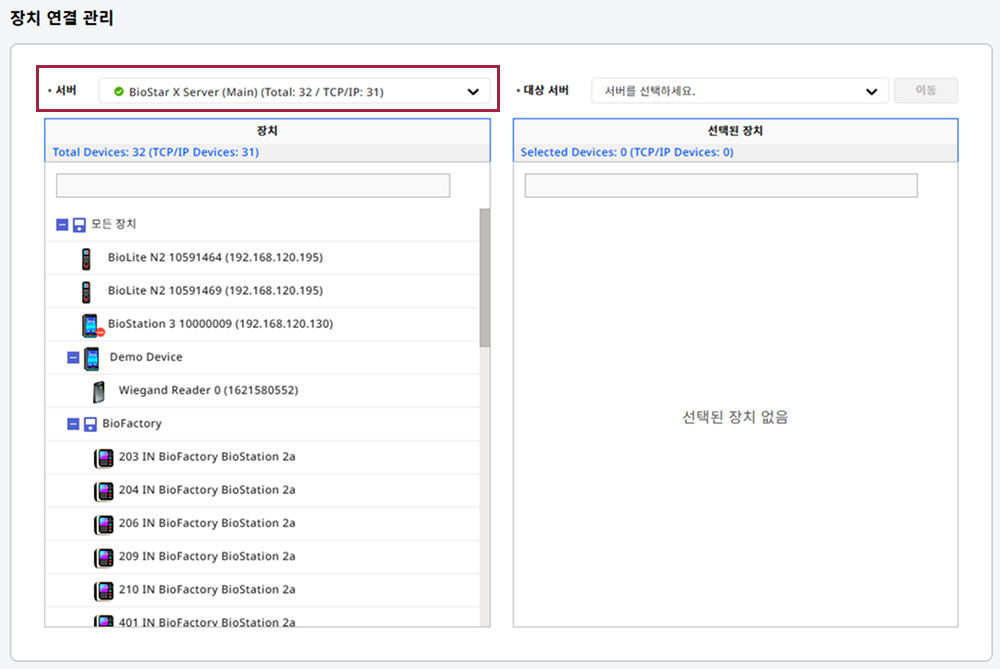 서버를 선택하면 해당 서버에 Wiegand, RS-485 연결 장치를 포함한 등록된 모든 장치를 확인할 수 있습니다.