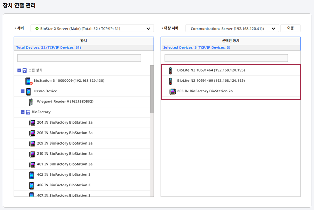 왼쪽에 서버 항목에서 이동시키려는 장치가 등록된 서버를 선택하세요.