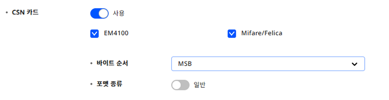 CSN 카드 및 포맷 종류를 선택하고 바이트 순서를 설정할 수 있습니다.