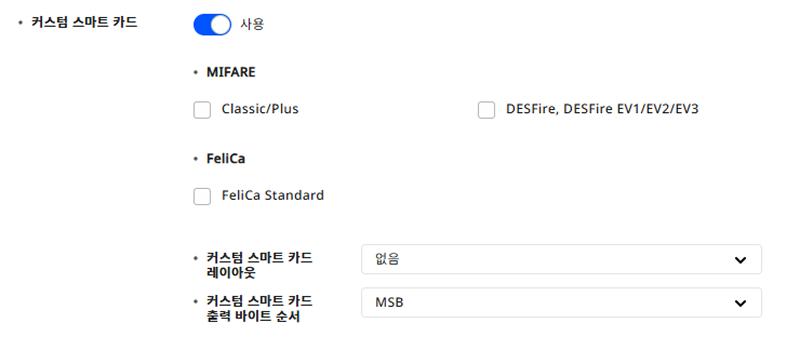 타사에서 발급한 커스텀 스마트 카드의 종류를 선택하고 카드 레이아웃과 바이트 순서를 설정할 수 있습니다.