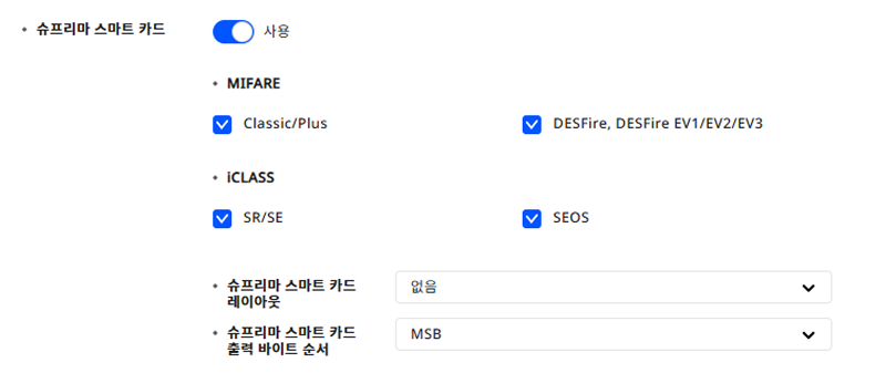 슈프리마 스마트 카드 종류를 선택하고 카드 레이아웃과 바이트 순서를 설정할 수 있습니다.