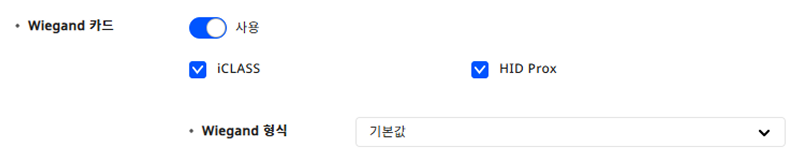 Wiegand 카드 종류를 선택하고 Wiegand 형식을 설정할 수 있습니다. Wiegand 형식 옵션에서 사용할 Wiegand 형식을 선택하세요.