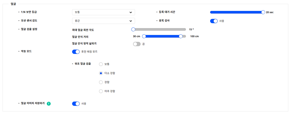 위조 얼굴 등록 검사 강화: 위조 얼굴 검사 등급을 설정하세요. 위조 얼굴 등록 검사 강화 등급이 높을수록 실제 얼굴에 대한 거부율도 높아질 수 있습니다.