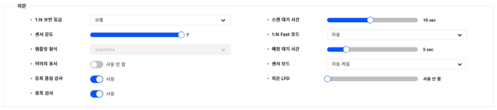 등록 품질 검사: 높은 품질의 지문 정보를 저장하기 위해 스캔한 지문의 품질을 검사할 수 있습니다. 사용으로 설정하면 지문 품질이 낮을 경우 사용자에게 알려주어 지문을 올바르게 스캔하도록 도와줍니다.