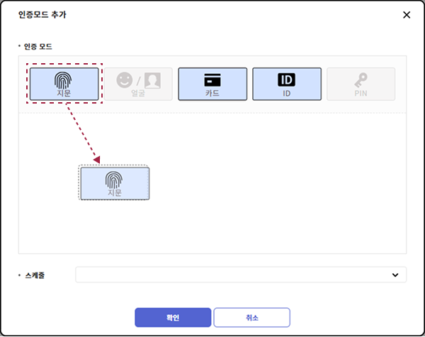 인증 모드 옵션에서 장치의 인증 모드를 설정하세요. 지문, 아이디, 카드, PIN, 얼굴과 같은 크리덴셜을 조합해 인증 모드를 설정할 수 있습니다.
